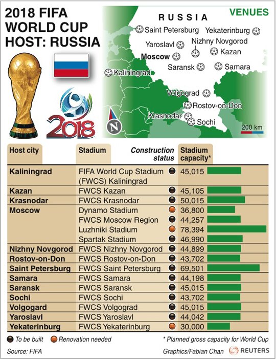 „Moszkvától Szocsiig, Kalinyingrádtól Jekatyerinburgig: tizenhárom városban tervezik megrendezni az oroszok a 2018-as futball-világbajnokságot. A FIFA/Reuters infografikán megtekinthetik a városok elhelyezkedését, a stadionok tervezett befogadóképességét, illetve azt, hogy milyen készültségi fokúak az arénák: a sötétbarna jelzés azt jelenti, hogy teljesen új stadiont építenek, a világosbarna pedig átalakítást.”